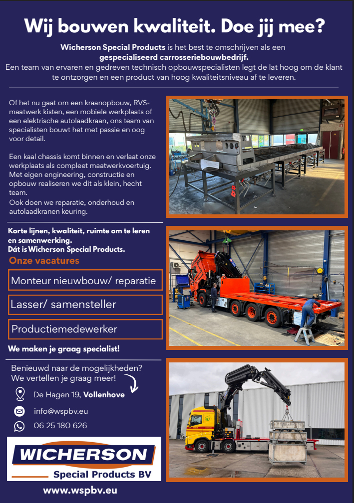 Wicherson Special Products is het beste te omschrijven als een bedrijf waar een team van ervaren en gedreven technisch opbouwspecialisten de lat hoog leggen om de klant te ontzorgen en een product af te leveren met een hoog kwaliteitsniveau.